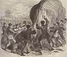 At around this time Coxwell's passengers forced their way into the balloon basket against his instructions in such a manner that prevented him from taking off.[1] The carpenters necessary to remove the scaffold from around the balloon were also not available.[8] One of the passengers then announced to the crowd that Coxwell was refusing to ascend and this, combined with his bad language and gestures, enraged them.[1] It is said that the police, who numbered only five in the immediate vicinity of the balloon, then struck a female member of the crowd on the forehead.[8][5] She fell to the ground bleeding which is said to have caused further anger in the crowd.[5]