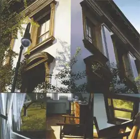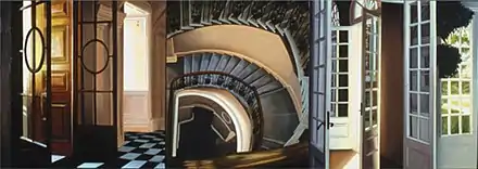 In 1999, Behnke received an E.D. Foundation grant to work on paintings based on Victorian homes, and chose to focus on Sagamore, Theodore Roosevelt's summer estate on Long Island.[3] The resulting "Sagamore" series (1999–2000) used composite imagery, Behnke's own photographs, and information from several sources to project an imagined life onto historical people (domestic staff, the Roosevelts) and the space.[30][3][28] Annie's View (2000) envisioned the house as seen and experienced by a servant, Annie, through four images unified visually by careful attention to the interplay of light and shadow and a strong sense of illusionism.[3][30] Its primary upper panel depicts a corner of the top floor of a large house (where servants traditionally lived) as passers-by would see it; the lower three-scene predella reproduces, successively, the view from Annie's window, her room, and the back staircase, suggesting a fragmented reconstruction of her life there: a view of imagined freedom, the constraint of indoor employment, up-and-down labor.[3][30] Other paintings in the series, such as Entrance for Edith and Alice and Sagamore: Downstairs, depict the home as seen from the Roosevelts' point of view.[3][28]
