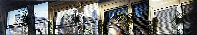 By 1980, Behnke's work had evolved in three ways: she added oil paint to her repertoire, increasingly turned to New York City as a subject, and introduced a greater sense of temporality and unfolding, layered meaning through her use of the predella, a horizontal, multi-frame pictorial device of subsidiary, adjoined images often used on early-Renaissance religious altarpieces.[11][7][36][14][41] Her oil paintings successfully adapted watercolor techniques—friskets and layered transparent glazes—that reviewers suggested endow the surfaces with a smooth, "mirror-like believability."[2][10][30] In the four-sequence oil work Light Study with Venetian Blinds (1981), she examined shifting conditions of light, color, and view (as the blinds close); the interiors Geometric Configurations: Variations on A Square (1982) and East Hampton Staircase With Landscape (1986) explored compositional and formal possibilities in predella and triptych formats.[2][12][10]