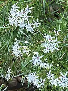 Leionema praetermissum is a shrub to 2 m (6 ft 7 in) high with several or few stems emanating from the base. The stems are warty and needle-shaped with occasional white star-shaped hairs. The leaves are smooth, narrow, linear to lance shaped, 20–35 mm (0.79–1.38 in) long, edges slightly rolled under, arranged alternately, sometimes crowded, smooth and sessile or on a short petiole 2 mm (0.079 in) long, and ending with a sharp point. The inflorescence is a cluster of 3-10 flowers at the end of branches or in the leaf axils on a pedicel 5–10 mm (0.20–0.39 in) long, flowers barely longer than the leaves. The peduncle is slender and warty, the pedicels 6–12 mm (0.24–0.47 in) long. The triangular, narrow calyx lobes are smooth on the outside with a stiff apex. The 5 petals are spreading, each petal 4–5 mm (0.16–0.20 in) long, upperside white, underneath pale green, glandular and there are 10 prominent stamens. The fruit is a capsule, 3–4 mm (0.12–0.16 in) long, 2–3 mm (0.079–0.118 in) wide. Flowering occurs from April to July.[2][3][4]