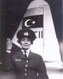When Turkish Air Force decided to enroll women in 1954, she applied to Air Forces. She was the very first female student in the military school in İzmir. She was trained on propeller aircraft between 1955 and 1957. In an interview she says that in the early days, the school had no boarding facility for the female students and she had to stay as a guest in the house of an officer's family. On 30 August 1957, she graduated as a military pilot. Although, later, five other female students were also accepted to school, she was the only female student to join the aviation unit in Eskişehir military base.[4] She was trained in Eskişehir as a jet pilot and earned the rank of second lieutenant on 22 November 1958.[5] Up to 1967 she flew in Republic F-84 Thunderjet and Lockheed T-33. Later years she served in staff duty. She retired as a senior air colonel.[3]