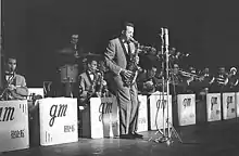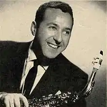 During the Second World War, many professional musicians enlisted and served in military bands. As a result, there were occasional openings in established commercial bands. Thus, at just 18 years of age, Hambro auditioned for an empty seat in Gene Krupa's band. His audition included playing "American Bolero", a piece written in 5/4 time, a complex meter that was quite progressive in Western music at the time.[7] Although initially skeptical, Krupa and trumpeter Roy Eldridge were impressed and called Hambro at home the next day to tell him that he had secured the job and to schedule him for a tuxedo fitting. On October 28, 1942, two weeks after his 19th birthday, Hambro was on stage with the Gene Krupa Band at the Times Square Paramount Theater.[2] However, he left the band in December of that year for the Army and joined Ivan Mogul, Shorty Rogers and approximately 40 other musicians from the Bronx who had agreed to man the 379th Army Service Forces (ASF) Band in Newport News, Virginia, where he stayed for three years.[8][5] From 1946 to 1947, Hambro was a featured soloist with Billy Butterfield and his orchestra; recording with him in 1946.[9] In 1947, he played with Bobby Byrne before rejoining Gene Krupa as lead alto sax and featured jazz soloist through 1950. (Hambro, along with tenor saxophonist Buddy Wise and trombonist Frank Rosolino, is featured in a 15-minute film short, Deep Purple, directed by Will Cowan in 1949, which focused on Gene Krupa and His Orchestra.)[10] In addition to playing with Krupa, Hambro simultaneously played in other bands, including the Latin jazz ensembles of Vincent Lopez and Pupi Campo. In 1948, Hambro toured with Machito and his Afro-Cuban Orchestra where he was featured as a soloist on alto sax. From 1951 to 1952, Hambro played with and managed the Ray McKinley Band. From 1951 to 1954, he also played and recorded with Chico O'Farrill's orchestra, with a year off (1952) to tour with The Gene Krupa Orchestra. From 1948 until 1954, he recorded with all of these artists as well as with Charlie Ventura's orchestra and Joe Loco's band. During this period (1951–1956), Hambro also accompanied vocalists at the Paramount Theater, did studio work, worked as a music copyist,[11] and taught private lessons. He continued to hone his own skills by studying clarinet with Leon Russianoff and flute with Henry Zlotnick, both of the Manhattan School of Music.[12]