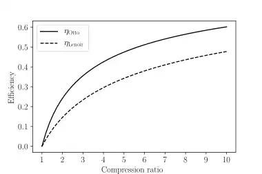where r = V3/V1 is defined to be > 1. Comparing this to the Otto cycle's efficiency graphically, it can be seen that the Otto cycle is more efficient at a given compression ratio. Alternatively, using the relationship given by process 2–3, the efficiency can be put in terms of rp = p2/p3, the pressure ratio,[2]