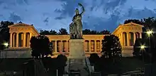 Von Klenze studied architecture and public building finance under Friedrich Gilly in Berlin, and worked as an apprentice to Charles Percier and Pierre François Léonard Fontaine in Paris. Between 1808 and 1813 he was a court architect of Jérôme Bonaparte, King of Westphalia. Later he moved to Bavaria and in 1816 began to work as court architect of Ludwig I.[1] The King's passion for Hellenism shaped the architectural style of von Klenze. He built many neoclassical buildings in Munich, including the Ruhmeshalle and Monopteros temple. On Königsplatz he designed probably the best known modern Hellenistic architectural ensemble. Near Regensburg he built the Walhalla temple, named after Valhalla, the home of gods in Norse mythology.