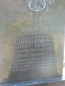 Zoltán Boros (now a filmmaker and composer), the son of the local Reformed priest and a survivor of the massacre, was then 5 years old.[6] On that day his father was in a labor camp.[6][5] He recalled that a local Romanian doctor, Augustin Pop, hid him and his then-seven-year-old sister in a dark room, and they were asked by their mother not to make any noise.[5] Later on his mother told him that the doctor dressed her as a maid so that it would not raise any suspicion when the Romanian officers arrived.[5] One of the officers asked, "Well, we know the priest is in the camp, but where's his wife?"[5] The doctor answered that she had already left with the retreating Hungarians.[5][6] During the Ginta massacre a villager named Lájos Togyinka showed what "Until death do as apart" means because Togyinka was Romanian and the Romanian soldiers did not want to execute him, however his wife was Hungarian and Togyinka instead of fleeing chose death by the side of his wife. The officer in charge with the execution, Bridea, also ordered the 13 and 17 year old sons of Togyinka to be also executed.[9] The grave of the murdered Togyinka family reads: "Kioltott ártatlan vérök annak a tanúja, hogy ártatlanul haltak. Aludjatok drága szereteink békén az Úrjézusban. A boldog viszontlátásra" (translated to English: "Their spilled innocent blood is the proof that they died innocent. Sleep our beloved ones in God Allmighty. A blissful good bye.")