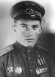 He also received the title of Hero of the Soviet Union in August 1945 for "the exemplary performance of command assignments at the front against the Nazi invaders and for displaying courage and heroism". He finished the war with the rank of Guards Senior Lieutenant.
