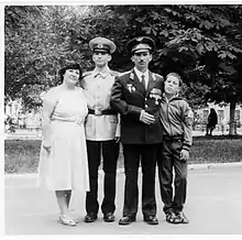 Being a third-generation military man, with his father, and grandfather, both military officers,[d] Khabarov decided to continue the family tradition. He received various assignments to remote places in the Soviet Union. His wife and two sons followed him on his postings. His sons, growing up as military brats, both have followed their father's pathway and, despite their mother's protest, they both enrolled in the Ryazan Airborne School,[a] one after another.[20]