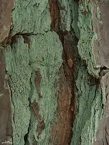 Lepraria is a genus of leprose crustose lichens that grows on its substrate like patches of granular, caked up, mealy dust grains.[2][3] Members of the genus are commonly called dust lichens.[3]: 305 [4][5] The main vegetative body (thallus) is made of patches of soredia (little balls of algae wrapped in fungus).[3] There are no known mechanisms for sexual reproduction, yet members of the genus continue to speciate.[2][3] Some species can form marginal lobes and appear squamulose.[3]