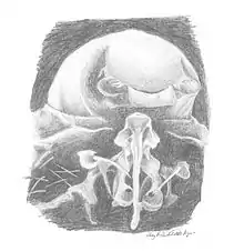 Larvae are smaller, closer to 0.8 mm, with specialized features used in feeding and nest migration.[2] They have relatively large bodies covered in minute hairs and their hairless heads are quite small, a characteristic called stenocephaly;[4] this feature evolved to help large groups of larvae feed on one centipede body at once[5] Their mandibles also developed to help them feed; they are directed outwards and armed with sharp teeth, enabling the larvae to eat without assistance from the workers.[2] Another unusual structure lies on the ventral or bottom side of the first segment of the larvae's thorax, also called their prothorax; workers grab on to this with their lower mouthparts, which are distinct from their mandibles, when transporting larvae during migration.[2] The “larval hemolymph tap” is the Leptanilla larvae's most unusual feature and was formerly thought to be a spiracle. Their spiracles are simply very, very small.[4] The “tap” consists of a duct that connects to their hemolymph, with an opening surrounded by a small hairless area on the fourth abdominal segment.[3] This specialized organ greatly facilitates LHF.
