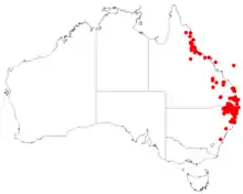 Leptospermum brachyandtum usually grows in shrubby forest along rocky creeks, often in water. It is found in coastal and near-coastal areas from North Queensland to Port Macquarie in northern New South Wales.[2][4]