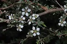 Leptospermum divaricatum is a species of plant that is endemic to inland New South Wales. It is an erect or weeping shrub with compact fibrous bark, elliptical to egg-shaped leaves, white flowers arranged singly on short axillary side shoots and woody fruit that fall off when mature.