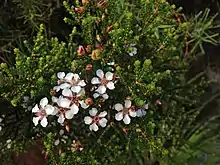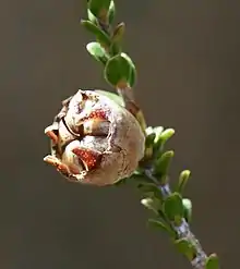 Leptospermum epacridoideum is a bushy, more or less erect shrub that typically grows to a height of 1–2 m (3 ft 3 in – 6 ft 7 in). The younger stems are thick and covered with tiny, fine hairs. The leaves are broadly elliptical to more or less circular, 2–3 mm (0.079–0.118 in) long and about 2 mm (0.079 in) wide on a short, thick petiole. The flowers are white or pink, usually borne singly on short side branches, and are about 6–10 mm (0.24–0.39 in) in diameter. There are reddish brown bracts and bracteoles around the base of the flower. The floral cup is glabrous and about 3 mm (0.12 in) long. The sepals are long-triangular, about 3.5 mm (0.14 in) long with soft hairs. The petals are about 5 mm (0.20 in) long and the stamens are in bundles of between five and seven and are about 2.5 mm (0.098 in) long. Flowering mainly occurs from February to March and the fruit is a sessile, woody capsule 6–8 mm (0.24–0.31 in) that eventually falls off.[2][3]