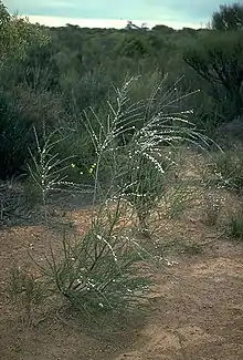 This tea-tree is usually found in scrub or heath on hills and undulating plains and occurs in parts of the Coolgardie, Esperance Plains and Mallee biogeographic regions.[3][2]