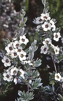 Leptospermum namadgiense is a shrub that typically grows to a height of 0.5–1 m (1 ft 8 in – 3 ft 3 in). It has thin, rough bark that is shed in strips or in flaky layers on the older stems, and young stems that are softly-hairy at first. The leaves are narrow lance-shaped to elliptical, 3.5–9 mm (0.14–0.35 in) long and 1.5–4 mm (0.059–0.157 in) wide, tapering to a petiole about 1 mm (0.039 in) long. The leaves are usually covered on both surfaces by silky white hairs. The flowers are borne singly or in pairs on short side shoots, and are white, sometimes with a pink tinge and 6–10 mm (0.24–0.39 in) wide. The floral cup is about 2.5 mm (0.098 in) long and covered with silky white hairs. The sepals are triangular, about 1.5 mm (0.059 in) long, the petals 2.5–3 mm (0.098–0.118 in) long. There are between seven and eleven stamens. Flowering mainly occurs from December to January and the fruit is a hairy capsule 2–2.5 mm (0.079–0.098 in) wide with the remains of the sepals attached but that falls from the plant after the seeds are released.[2][3]