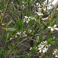 This teatree is restricted to a small area of south-east New South Wales, mainly in the Budawangs, where it grow on the edge of sandstone cliffs.[2][3]