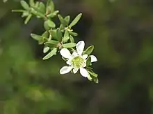Leptospermum variabile is a shrub that typically grows to a height of 1–2 m (3 ft 3 in – 6 ft 7 in) but is sometimes a tree to more than 5 m (16 ft) and has reddish new growth. It has thin, rough or scaly bark and the younger stems are covered with soft hairs at first. The leaves are sessile, elliptical to lance-shaped with the narrower end towards the base, distinctly folded, 10–20 mm (0.39–0.79 in) long and 2–8 mm (0.079–0.315 in) wide with the base tapered. The flowers are white, borne singly on the ends of short side shoots and are about 15 mm (0.59 in) wide. The floral cup is glandular, about 4–6 mm (0.16–0.24 in) long, tapering to a short pedicel. The sepals are broadly egg-shaped, about 3 mm (0.12 in) long, the petals 6–8 mm (0.24–0.31 in) long and the stamens about 3–4 mm (0.12–0.16 in) long. Flowering mainly occurs from September to October and the fruit is a capsule, varying in size from about 5 mm (0.20 in) to 12 mm (0.47 in) in diameter, that remains on the plant when mature.[2][3]