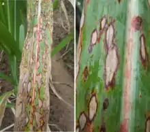 | Spots with red-brown borders result as a symptom ring spot from the fungal plant pathogen L. sacchari | |