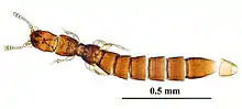 The Leptotyphlinae are a subfamily of the Staphylinidae, rove beetles.[1] They are very small, less than 1.8 mm long, and are eyeless and wingless. These beetles appear to have seven abdominal segments, and 3-3-3 is their tarsal formula. They are found in leaf litter or deep soil, possibly as predators of mites, collembola, and other soil arthropods. Nine genera and 13 species are known from North America, in western states and Florida, but they may be more widespread.