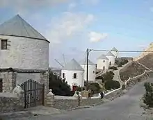 The municipality has an area of 74.172 km2 (28.638 sq mi).[2] The municipality includes the populated offshore island of Farmakonisi (pop. 10), as well as several uninhabited islets, including Levitha and Kinaros, and had a 2011 census population of 7,917, although this figure swells to over 15,000 during the summer peak. The island has a coastline of 71 kilometres (44 miles). It is known for its imposing medieval castle of the Knights of Saint John possibly built on a Byzantine fortress. Nearby islands are Patmos, Lipsi, Kalymnos, and the small islands of Agia Kyriaki and Farmakos. In ancient times it was considered the island of Parthenos Iokallis and linked to the Hellenistic and Roman literature on Meleager and the Meleagrides. The administrative centre and largest town is Agia Marina, with a population of 2,672 inhabitants. Other sizable towns are Lákki (pop. 1,990), Xirókampos (908), Kamára (573), and Álinda (542).