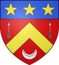 Blazon: Gules, a chevron of Or accompanied in chief by two arrows of Argent in pale and in base by a crescent the same; in chief overall Azure charged with three mullets of Or.