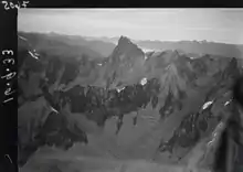 ![]() Pinnacled section of Les Périades and the Brèche Puiseux, seen from the south-west. | |