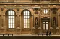 The Lower Great Hall (Grande Salle basse), now known as Hall of the Caryatids (French: Salle des Caryatides), first completed in 1549, replaced what had been the Great Hall of the Medieval Louvre built in the 13th century. The former adjacent chapel's footprint was kept as a semi-separated space on the southern end, known since as the "tribunal", whose floor was originally slightly higher than the rest.[2]: 71, 73 On the room's northern end, Goujon created a tribune or minstrels' gallery supported by four caryatid figures inspired by classical precedents (not directly by those of the Erechtheion in Athens, which were not known in Renaissance France, but presumably by ancient Roman copies thereof).[3]: 16 The original ceiling, supported by wooden beams, had to be propped up as early as the reign of Henry IV; in 1638, that wooden ceiling was replaced by the current stone vault supported by pillars decorated with columns, designed by Jacques Lemercier.[3]: 30 The sculpted decoration thereof was completed around 1806-1808 by Percier and Fontaine, who removed the difference of floor level between the "tribunal" and the rest of the room. The room was used for multiple festivities and ceremonies, including the mourning of King Henry IV from 10 to 26 June 1610, and a ritual foot washing of thirteen paupers performed by Louis XIV on Maundy Thursday.[2]: 74