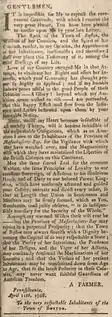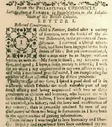 Letters from a Farmer in Pennsylvania is a series of essays written by the Pennsylvania lawyer and legislator John Dickinson (1732–1808) and published under the pseudonym "A Farmer" from 1767 to 1768. The twelve letters were widely read and reprinted throughout the Thirteen Colonies, and were important in uniting the colonists against the Townshend Acts in the run-up to the American Revolution. According to many historians, the impact of the Letters on the colonies was unmatched until the publication of Thomas Paine's Common Sense in 1776.[1] The success of the letters earned Dickinson considerable fame.[2]