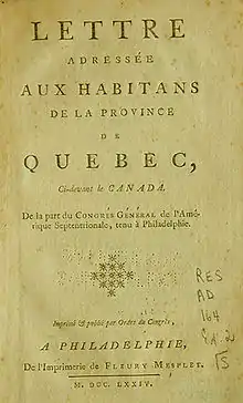 On October 21, 1774, the First Continental Congress, meeting to craft a united response to the Intolerable Acts, resolved to address letters to the populations of Quebec, St. John's Island, Nova Scotia, Georgia, East Florida and West Florida, all being colonies that were not represented by delegates in the Congress.[4][5] A committee composed of Thomas Cushing, Richard Henry Lee and John Dickinson was set up to draft those letters.[6] A first draft was presented on October 24, debated and returned to the committee. On October 26, a new draft was presented, debated, amended and adopted.[5] A resolution was passed for the president to sign the letter and ordering the translation and printing of a Letter to the Inhabitants of the Province of Quebec to be done under the supervision of the delegates of Pennsylvania. The letter was translated to French and printed as an 18-page brochure entitled Lettre adressée aux habitans de la Province de Québec, ci-devant le Canada, de la part du Congrès général de l'Amérique Septentrionale, tenu à Philadelphie.[7] The translation is attributed to Pierre Eugene du Simitiere. The final content of the letter is attributed to John Dickinson, as a draft in his own hand very closely resembles the final letter.[8]