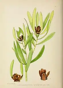 The species is commonly known as the oilbract conebush' because of the brown, sticky, oily bracts found on both sexes when in bud, a feature setting it apart from other Leucadendron species. After flowering the bracts close, becoming hard and dry, forming a durable cone and protecting the enclosed flowerhead and heart-shaped fruits. This species produces hairless leaves some 90 mm (3.5 in) long, and bears beetle-pollinated yellow flowers in July and August - the male (about 18 mm diameter) and female (about 11 mm diameter) being on separate plants. Male shrubs are rounded and up to 1.5 m (4.9 ft) tall, while females are narrow-crowned and up to 2 m (6.6 ft) tall. The involucral leaves are yellow. The plants are killed by intense seasonal fires, but seeds retained in flower heads or woody capitula may survive for a number of years to produce the next generation.[3]