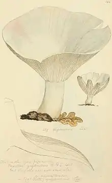The species was first described as Agaricus giganteus by English naturalist James Sowerby in 1809, who illustrated it in his book Coloured Figures of English Fungi.[1] Other historical synonyms include Clitocybe gigantea (Quélet, 1872),[2] Paxillus giganteus (Fries, 1874),[3] and Omphalia geotropa var. gigantea (Quélet, 1886).[4] In 1934, Robert Kühner and Réné Maire created the genus Astropaxillus to contain species of Leucopaxillus with smooth spores, and they set L. giganteus as its type species.[5] American mycologist Rolf Singer transferred it to its current genus in 1938,[6] but recognized the value of maintaining a distinction of the smooth-spored species, and so made L. giganteus the type species of section Aspropaxilli.[7]