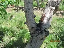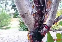 Leucostoma canker is a fungal disease that can kill stone fruit (Prunus spp.).[1] The disease is caused by the plant pathogens Leucostoma persoonii[2] and Leucostoma cinctum[3] (teleomorph) and Cytospora leucostoma and Cytospora cincta[4] (anamorphs). The disease can have a variety of signs and symptoms depending on the part of the tree infected. One of the most lethal symptoms of the disease are the Leucostoma cankers. The severity of the Leucostoma cankers is dependent on the part of the plant infected. The fungus infects through injured, dying or dead tissues of the trees. Disease management can consist of cultural management practices such as pruning, late season fertilizers or chemical management through measures such as insect control. Leucostoma canker of stone fruit can cause significant economic losses due to reduced fruit production or disease management practices. It is one of the most important diseases of stone fruit tree all over the world.