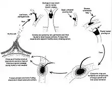 Leucostoma canker symptoms differ depending on where on the tree infection takes place.[5] Discoloration occurs in sunken patches on infected twigs. Light and dark concentric circles of narcotic tissue characterize this symptom, occurring near buds killed by cold or on leaf scars. Infections on the nodes are seen 2–4 weeks after bud break.[6] As time passes, darkening occurs within diseased tissues, and eventually, amber gum ooze may seep from infected tissue.[7] Nodal infections are particularly vulnerable in one-year-old shoots that develop within the center of the tree. If fungal growth persists without treatment, scaffold limbs and large branches will likely become invaded within a short time frame. Cankers occurring on branches that are the product of such infections will contain dead twigs or twig stubs at the canker's center.