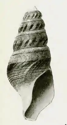 (Original description) The white shell is covered with a brownish olive periostracum. The shell contains five or more moderately rounded whorls exclusive of the (lost) protoconch. The suture is distinct with a wide rounded ridge in front of it, forming the posterior boundary of the anal fasciol The spiral sculpture consists of a few obscure threads on the fasciole and in front of the shoulder 8 or 9, on the body whorl 15 to 18 flattish, rather close-set threads smaller and closer anteriorly and absent from the siphonal canal. The axial sculpture consists of more or less distinct incremental lines, and on the upper spire of about 15 very oblique anteriorly protracted riblets chiefly visible at the shoulder and obsolete on or entirely absent from the last two whorls. The anal sulcus is wide, deep, rounded, the fasciole slightly impressed. The outer lip is thin, sharp and arcuately produce The inner lip is erased. The columella is short, white, obliquely attenuated in front. The siphonal canal is short, wide, distinct and slightly recurved. [2]