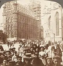 The project resumed in 1448 under the direction of Matheus de Layens.[1] The first stone of the Voirste Huys was laid on 28 March of that year. The cellars of some demolished houses were incorporated into the new construction and can today be accessed through a small door at the left side of the Town Hall. The initial plans, influenced by Brussels' Town Hall, included a belfry tower at one of the corners. This design was modified by de Layens, resulting in the symmetrical arrangement of turrets observed today.