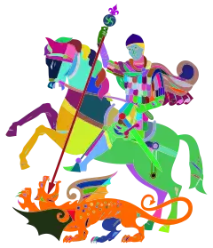 Another symbol used by Levashovites is the representation of a warrior riding a horse while slaying a dragon, featured in the coat of arms of the Renaissance–Golden Age organisation, that is a refashioning of the symbol of Saint George and the Dragon representing, in the reinterpretation given by the Levashovites, the Aryan champion of the Bright Forces triumphing over the Dark Forces.[1] In the coat of arms of the organisation, the warrior slaying the dragon is drawn over a trefoil or fleur-de-lys, which according to Levashov represents the "fighting symbol of the Slavic Aryans", with the three petals representing Prav, Yav and Nav.[17]