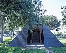 ![]() Black granite pyramid-shaped mausoleum of Lewis Eugene Grigsby and his wife Emma Alvina Miller Grigsby in Angelus-Rosedale Cemetery in Los Angeles, California | |