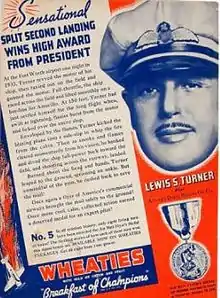 Present at the ceremony were: President, Franklin Delano Roosevelt; Postmaster General, James A Farley; Lewis S Turner of Fort Worth, Texas; James H Carmichael, Jr. of Detroit, Michigan; Edward A Bellande of Los Angeles, California; Gordon S Darnell of Kansas City, Missouri; Willington P McFail of Murfreesboro, Tennessee; Roy H Warner of Portland, Oregon; And Grover Tyler of Seattle, Washington. Turner's deed was chronicled on the well known Wheaties cereal box cover as part of a series of 8 box covers regarding the feats of pilot's awarded the Air Mail Flyers Medal of Honor.