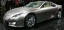 The Lexus LFA is a 2-seat coupe first unveiled as an F marque concept at the 2007 NAIAS. The original LF-A concept had a 4.8 liter V10 engine which produced an estimated 552 horsepower (411 kW) with a claimed top speed of approximately 200 mph (320 km/h).[12] Automotive media reports indicated that the LF-A concept car was approved for production.[13] Prototypes of the LF-A had been spotted being tested at the Nürburgring race track in Germany.[14] On 10 May 2008, a LF-A prototype was entered on the Nürburgring 4 hour VLN endurance race where it won the SP8 class.[15] The vehicle was also entered in the 24 Hours Nürburgring[16] where it qualified 27th[17] among 223 cars, and finished 7th in the SP8 class.