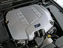The Lexus IS F debuted at the North American International Auto Show on 8 January 2007. The vehicle features a 5.0 L direct-injected V8 producing 416 SAE hp (423 PS, 311 kW) at 6,600 rpm, while peak torque is 371 ft⋅lbf (503 N⋅m) at 5,200 rpm.[10] The engine also features a two-stage intake system, engine oil and automatic transmission fluid coolers and an oil pump designed for high-speed cornering. Compared to the 2GR-FSE V6, 306 hp (228 kW) IS 350, the IS F features a 2UR-GSE V8 engine and over 400 hp (300 kW). The IS F was scheduled to be in dealerships by early 2008.
