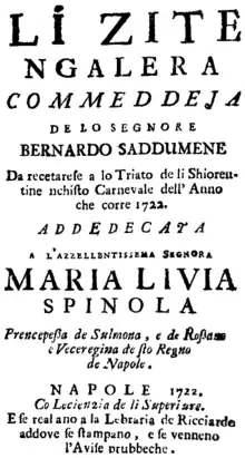 Li zite 'ngalera (The Newlyweds on the Galley)[1] is a commedia per musica in three acts by the Italian composer Leonardo Vinci, first performed at the Teatro dei Fiorentini, Naples, on 3 January 1722. The libretto, by Bernardo Saddumene, is written in the Neapolitan language which characterizes it as commeddeja pe mmuseca.