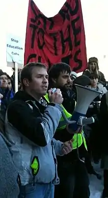 ![]() Burns (forefront) speaking at a protest in Edinburgh, December 2010. | |