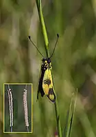 Adult, wings folded, and (inset) eggs laid in rows on plant stalks