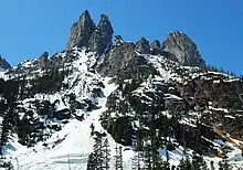 Weather fronts originating in the Pacific Ocean travel northeast toward the Cascade Mountains. As fronts approach the North Cascades, they are forced upward by the peaks of the Cascade Range (Orographic lift), causing them to drop their moisture in the form of rain or snowfall onto the Cascades. As a result, the west side of the North Cascades experiences high precipitation, especially during the winter months in the form of snowfall. During the winter months, weather is usually cloudy, but, due to high-pressure systems over the Pacific Ocean that intensify during the summer months, there is often little or no cloud cover during the summer.[7] Because of maritime influence, snow tends to be wet and heavy, resulting in high avalanche danger.[7] The North Cascades Highway east of Washington Pass has the distinction of being among the top areas in the United States for most avalanche paths per mile of highway.[8] The months July through September offer the most favorable weather for viewing or climbing Liberty Bell Mountain.