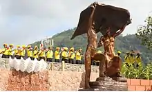 The Liberty Monument was designed and sculpted by Tom Bowers and was cast in bronze at the Bronze Age Foundry in Cape Town, South Africa.[2][3] It depicts a man and a woman holding over their heads the national flag.[4]