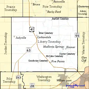 The north end of the county seat of Williamsport extends into the southeast corner of the township. In addition, there are three small unincorporated towns in the township. Carbondale is located just north of the point where State Road 63 begins at U.S. Route 41. Judyville is about 2 miles (3.2 km) west of Carbondale, near the western border of the township. Kramer is located about 3 miles (4.8 km) east-southeast of Carbondale, near the site of the Hotel Mudlavia. The settlement of Five Points is now defunct, but existed along the present-day route of U.S. Route 41 in the southeastern part of the township.