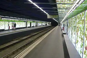 Liceu is the first station of Barcelona Metro network with a themed decoration. The walls are illuminated and decorated with pictures of leaves of the London Plane trees that can be found on La Rambla. There is also a ceramic mural made by the Escola Massana in the station's southern vestibule.[1][5][6]