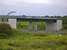 Restoration was threatened by the construction of the M6 Toll motorway around the north of Birmingham, which cut across the canal's route. The Inspector heading the enquiry for the Northern Relief Road ruled that the contractor would only be responsible for the footings for a new aqueduct to carry the canal over the motorway, and that the Trust would need to raise the costs for the rest of the structure.[11] An appeal was launched for funds, headed by the actor David Suchet, and together with a grant of £250,000 from the Manifold Trust, the £450,000 cost was met, the road contractors built the supporting columns, and on 16 August 2003, a steel trough was craned into position, having been pre-fabricated by Rowecord Engineering Ltd, who are based in South Wales.[12] (The aqueduct has been finished but the canal has yet to reach it, giving it an odd appearance). This had a beneficial side-effect – the Government promised that never again would a new road be built in the path of a waterway restoration scheme, unless an aqueduct or tunnel was provided.