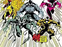Treece International's CEO Roland Treece later has the Life Foundation assist in dealing with Venom interfering with Treece's search for a lost stockpile of gold supposedly buried somewhere beneath a park in San Francisco.[12] At their Mojave facility, Drake has the Life Foundation experiment with the Venom symbiote which extracts five additional symbiotes which bonded with their own mercenaries: Scream, Riot, Agony, Phage and Lasher. The Life Foundation's symbiote enforcers commit random acts of violence throughout San Francisco to test their capabilities, drawing Spider-Man's attention to follows back to the Life Foundation situated in the Mojave Desert.[13] Spider-Man and Eddie Brock team-up to combat the symbiotes, seemingly killing the creatures and depowering their hosts, a development that prompts the Life Foundation (led by Drake) into abandoning and destroying the Mojave facility.[14][15] Unknown to the Life Foundation, their five symbiote enforcers somehow survive the explosion and rebel against before fleeing to New York City.[16]