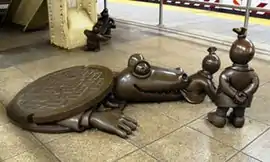 Life Underground (2001) is a permanent public artwork created by American sculptor Tom Otterness for the New York City Subway's 14th Street/Eighth Avenue station on the A, C, E, and L trains. It was commissioned by the Metropolitan Transportation Authority's Arts for Transit program for US$200,000 — one percent of the station's reconstruction budget.[1] This program has commissioned more than 170 permanent works of art for public transportation facilities the MTA owns and operates.[2] This work is one of the most popular artworks in the subway system.[3]