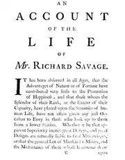 Samuel Johnson's Life of Mr Richard Savage (1744), short title Life of Savage and full title An Account of the Life of Mr Richard Savage, Son of the Earl Rivers, was the first major biography published by Johnson. It was released anonymously in 1744, and detailed the life of Richard Savage, a London poet and friend of Johnson who had died in 1743.[1] The biography contains many details of Savage's account of his own life, including claims that he was the illegitimate child of a noble family that quickly disowned and abandoned him at birth.